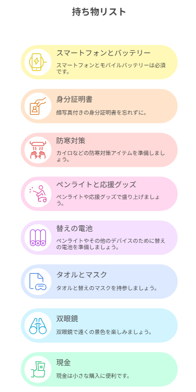 ペンライトは必須ではありませんが、会場の一体感を味わうためには持っていくことを強くおすすめします。