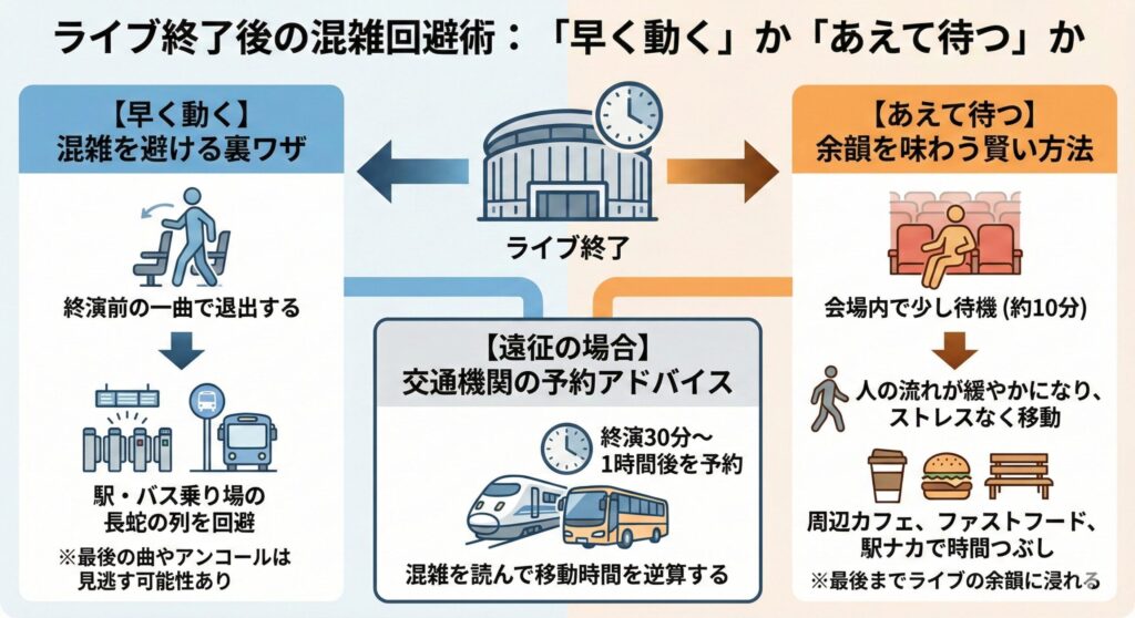 ライブ終了直後の混雑を避けるには、「早く動く」か「あえて待つ」か、自分の予定に合わせて行動を選ぶことが一番の近道です。