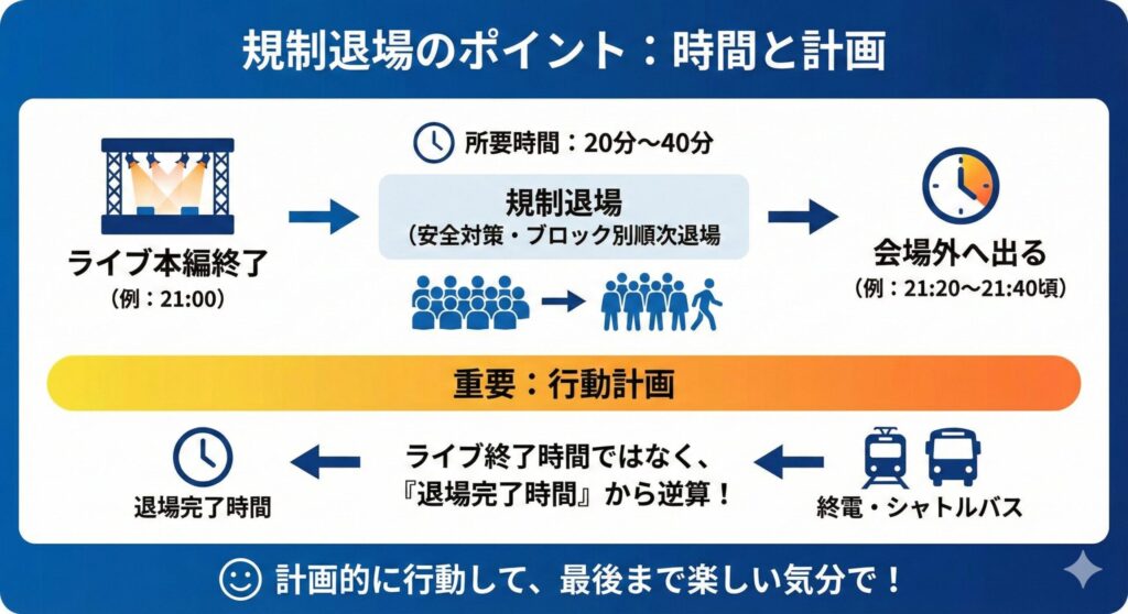 ライブ参加の際は「本編+アンコール時間+規制退場30分」をセットで考えておくことで、帰りの不安を軽減できます。