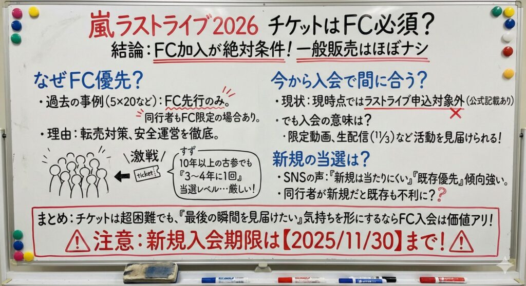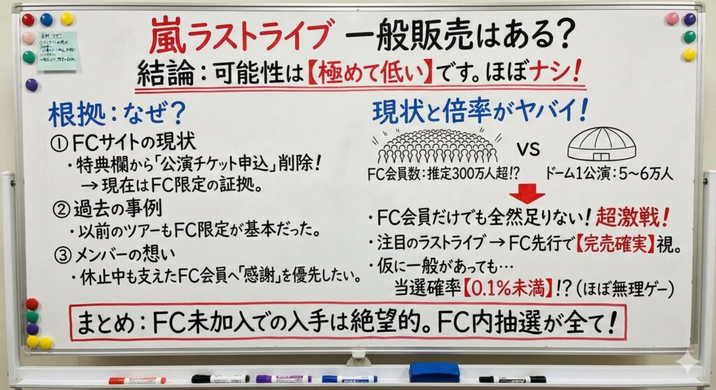 嵐ラストライブのチケット一般販売は、極めて低いと考えるのが自然です。