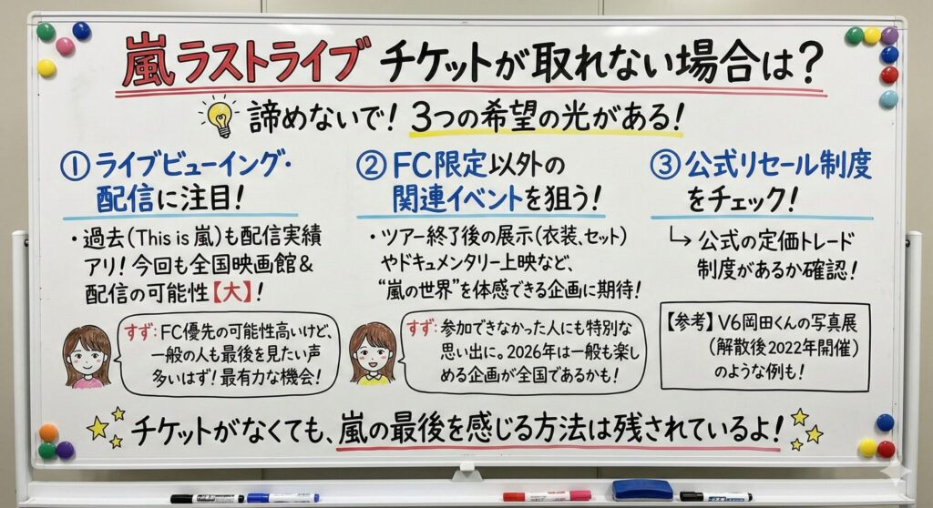 チケットが取れなくても、嵐のラストライブを体験できる希望の光はいくつか残されています。