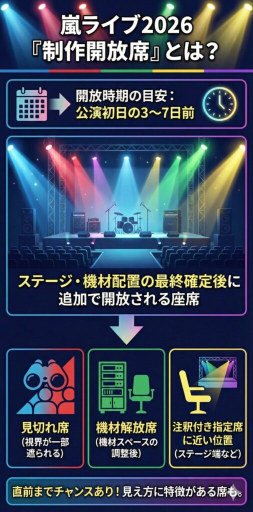 嵐ライブ2026における「制作開放席」とは、ステージセットや機材配置が最終確定したあとに、追加で開放される座席のことです。