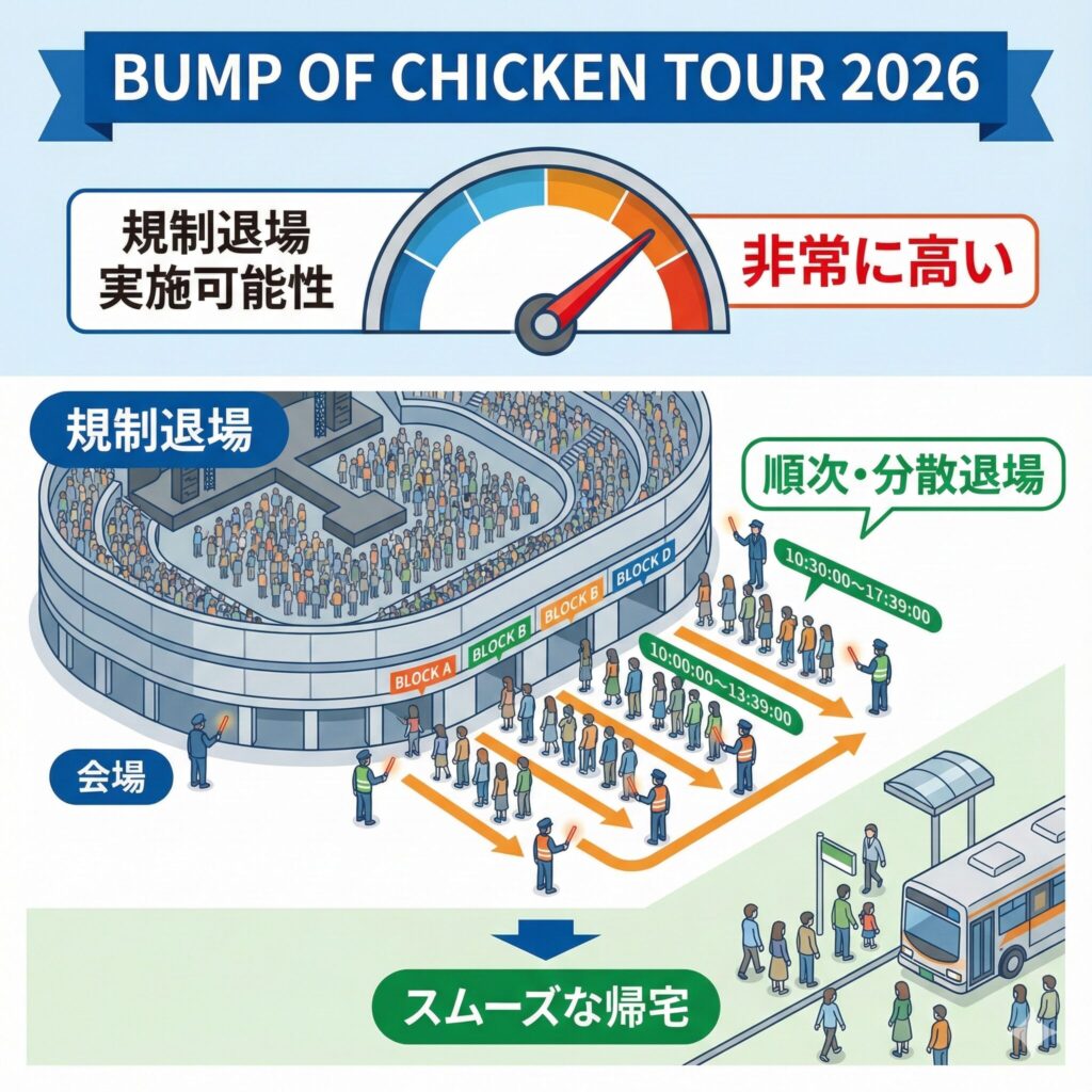 2026年ツアーはアリーナ規模の公演が中心で、過去の同規模ツアーではほぼ例外なく規制退場が行われるでしょう。