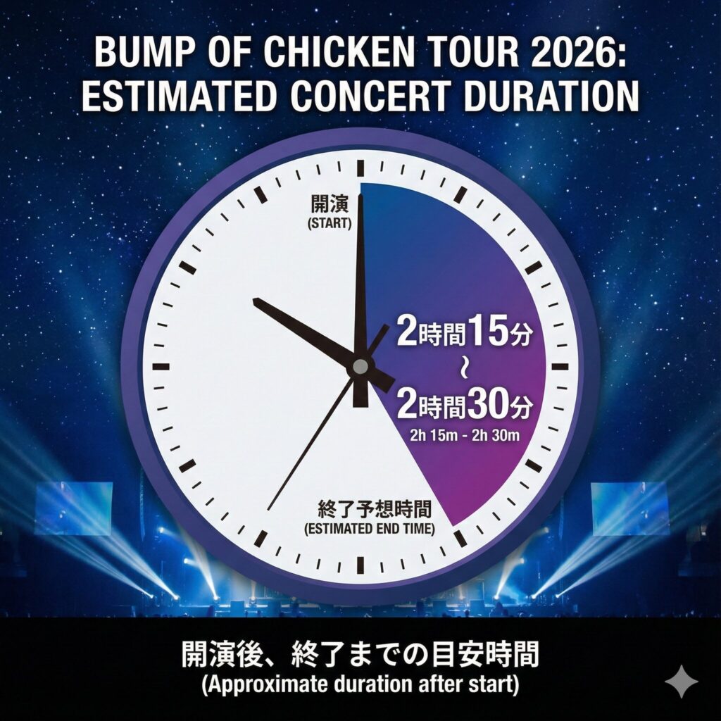 BUMP OF CHICKEN TOUR 2026はアリーナ公演が中心となるため、終了時間は20:15〜20:30頃、規制退場も実施される可能性が高いと予想されます。