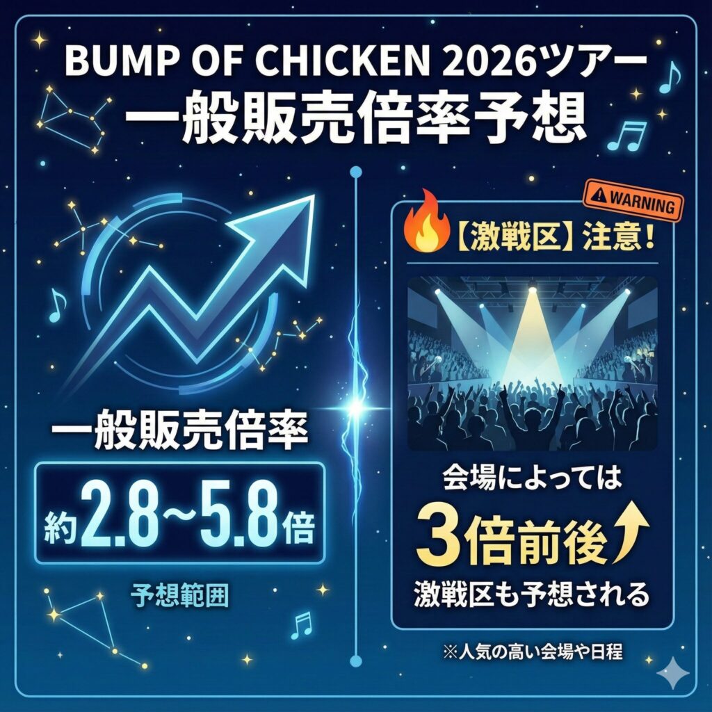BUMP OF CHICKEN 2026ツアーの一般販売倍率は、約2.8〜5.8倍と予想します。