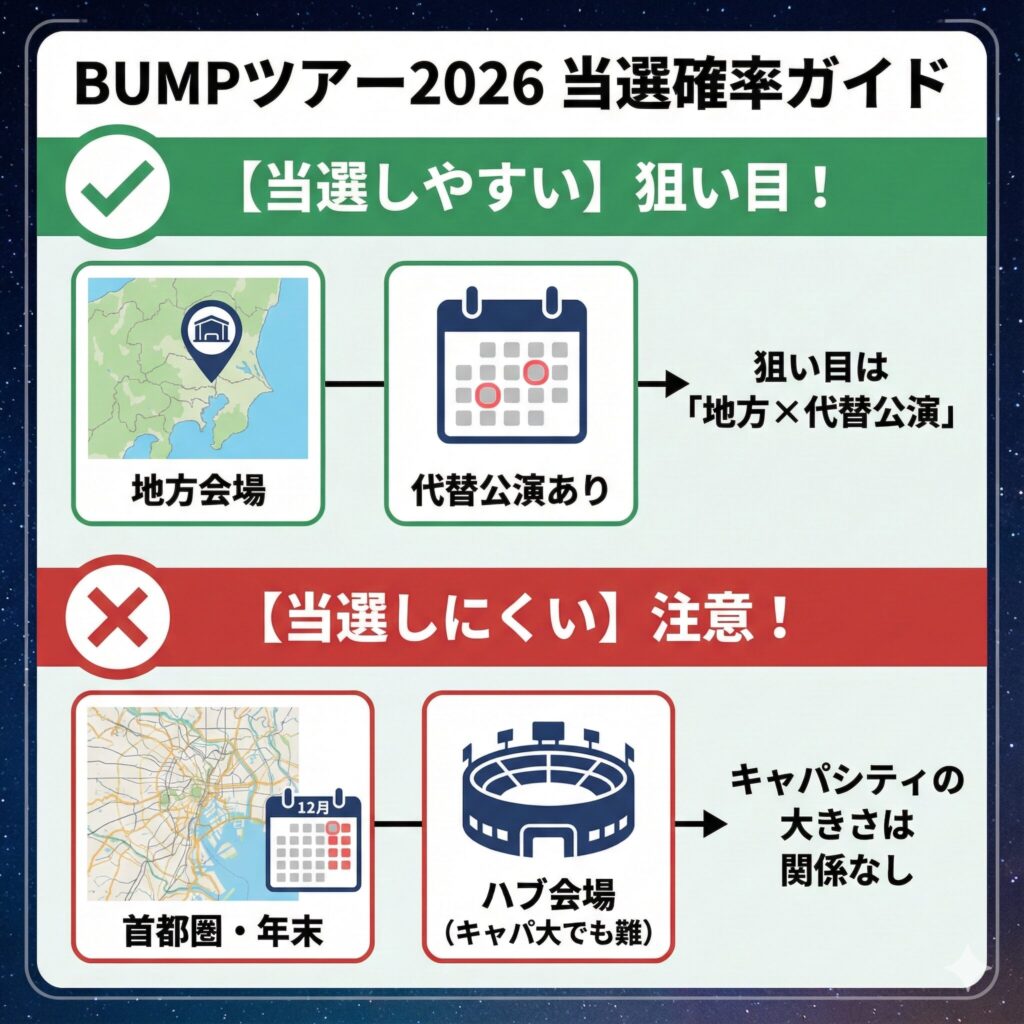 BUMPツアー2026で当選しやすい公演は、「人気が低い」のではなく「応募が分散する」公演です。
