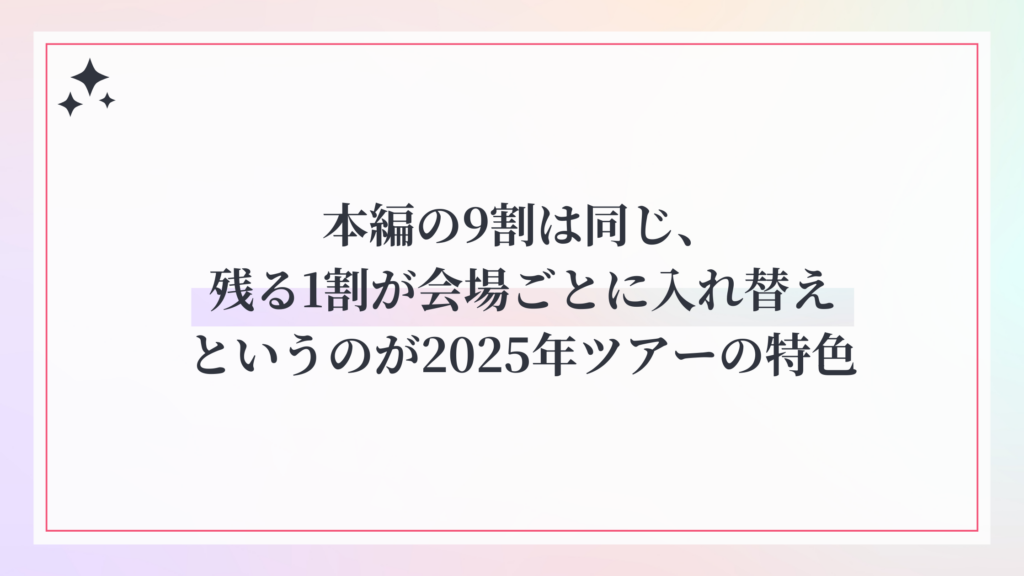 本記事では、実際の公演内容をもとに、曲が変わる理由や演出の意図まで読み解きながら、2025年ライブの魅力と全体像を徹底的にお伝えします。