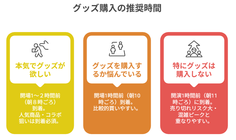 この時間帯に動けば、グッズだけじゃなく、フードやクローク、フォトスポットにも余裕を持って対応できるよ。