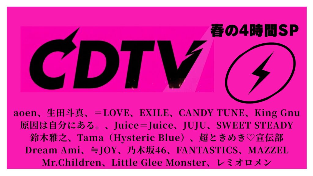 今回のCDTV春のスペシャルは、3月30日(月)午後7時からの4時間放送となります。