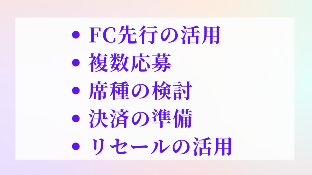 チケット当選確率を最大化するための最も確実な方法は、公式ファンクラブ(FC)先行に最優先で申し込むことです。