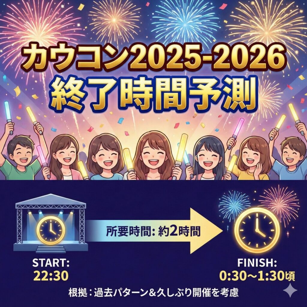 カウコン2025‐2026の終了時間は、「0時30分〜1時30分」までの幅で収まる可能性がきわめて高いと予測できます。