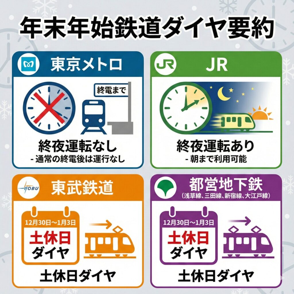 特に東京メトロは終夜運転がないため、JR利用や徒歩移動・タクシー・始発待ちなど事前準備が重要です。