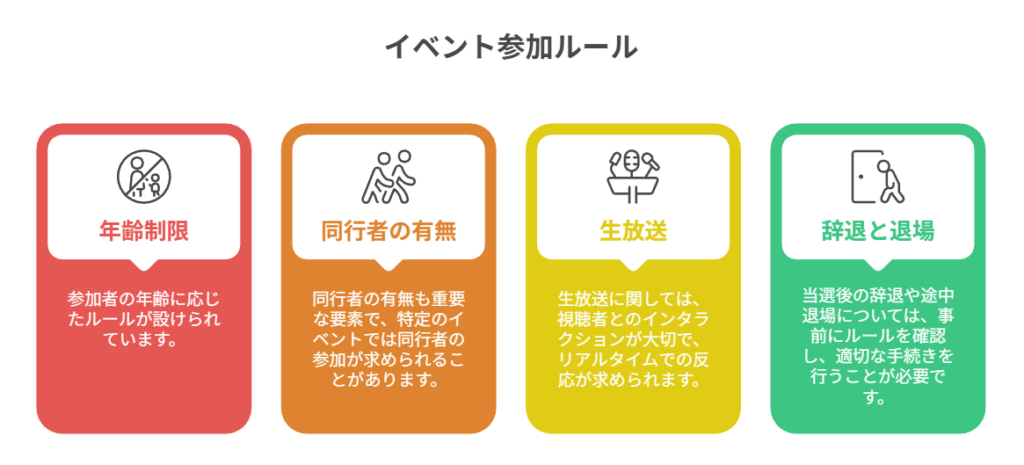 A: 原則として当選後の辞退や途中退場はできません。特に生放送や収録の途中で観客が動くと、番組の進行に大きな影響が出てしまいます。過去の募集要項にも「必ず参加できる方のみご応募ください」と注意書きがありましたので、確実な日程でのみ応募しましょう。