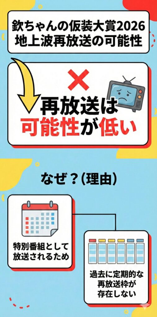 欽ちゃんの仮装大賞2026は、地上波での再放送が行われる可能性は低いです。