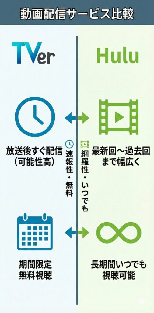 近年はTVerとHuluでの配信実績が豊富で、放送後すぐにTVerで期間限定の無料配信、その後Huluで長期視聴できる流れが定着しています。