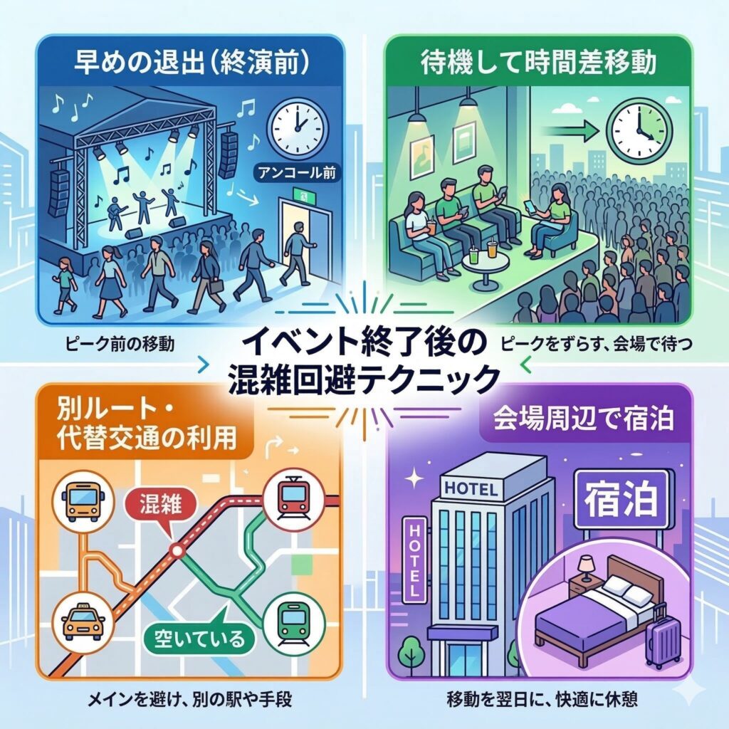 数万人規模が集まるアリーナツアーにおいて、終演後の大混雑を避けるための現実的な方法は次の4つです。