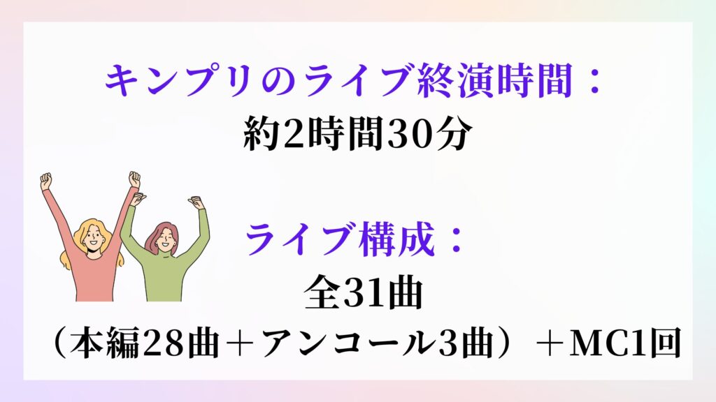 キンプリのライブ終演時間は、約2時間30分〜2時間35分です。