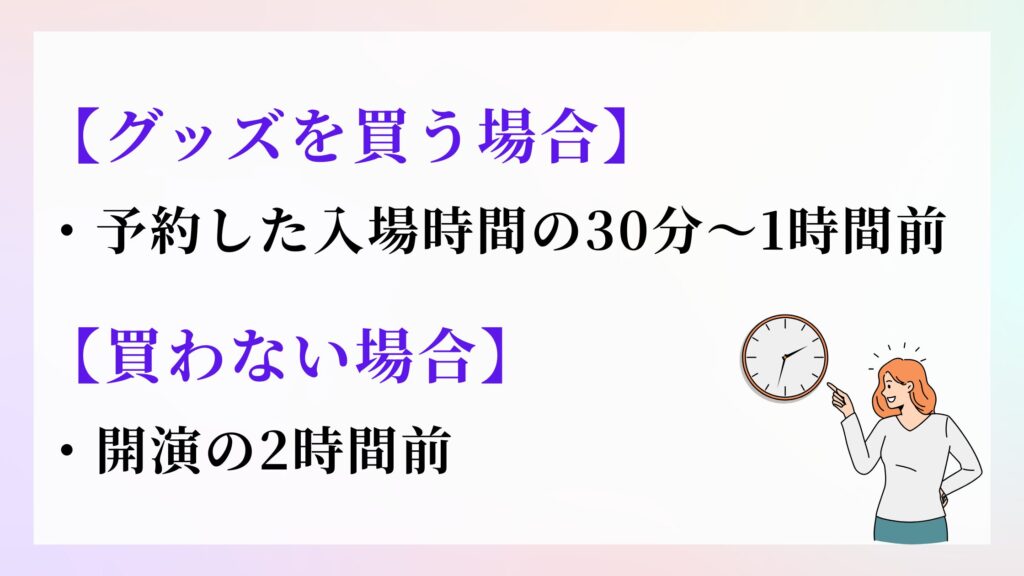 ライブ当日の到着時間は、グッズを会場で購入するかどうかで決まります。