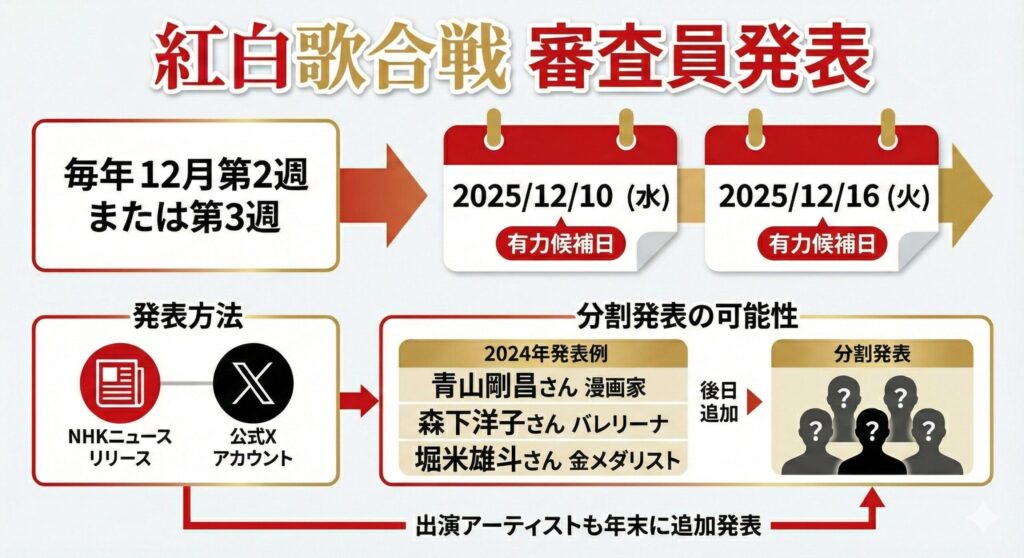 紅白2025の審査員は、例年通り12月上旬〜中旬(10〜15日頃)に発表される見込みです。