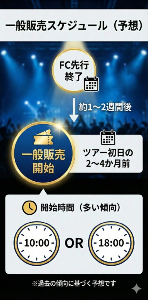 現時点では一般販売日は未発表ですが、ファンクラブ先行終了後の1月下旬〜2月上旬に開始される可能性が高いと予想されます。