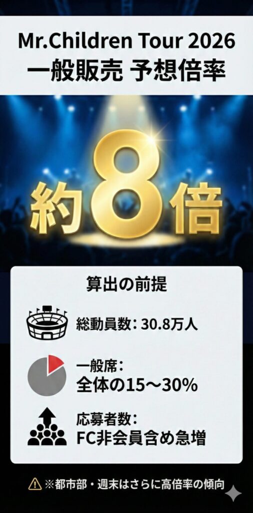 Mr.Children Tour 2026の一般販売倍率は、8倍前後の可能性が高いです。