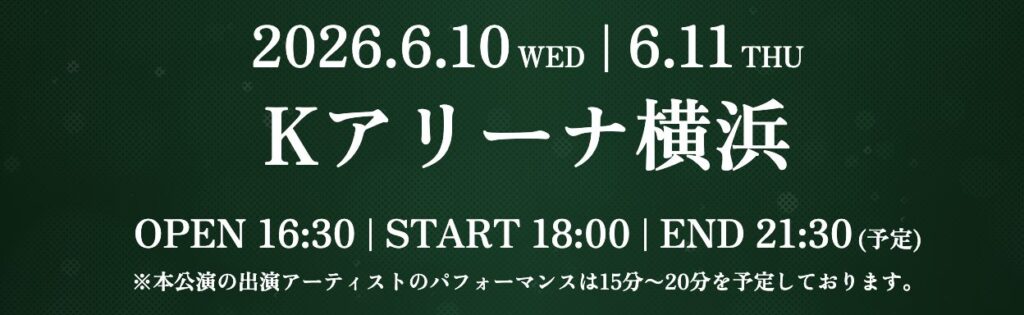 - 開催日程:2026年6月10日(水)・11日(木)の2日間で、開演18:00・終演予定21:30。