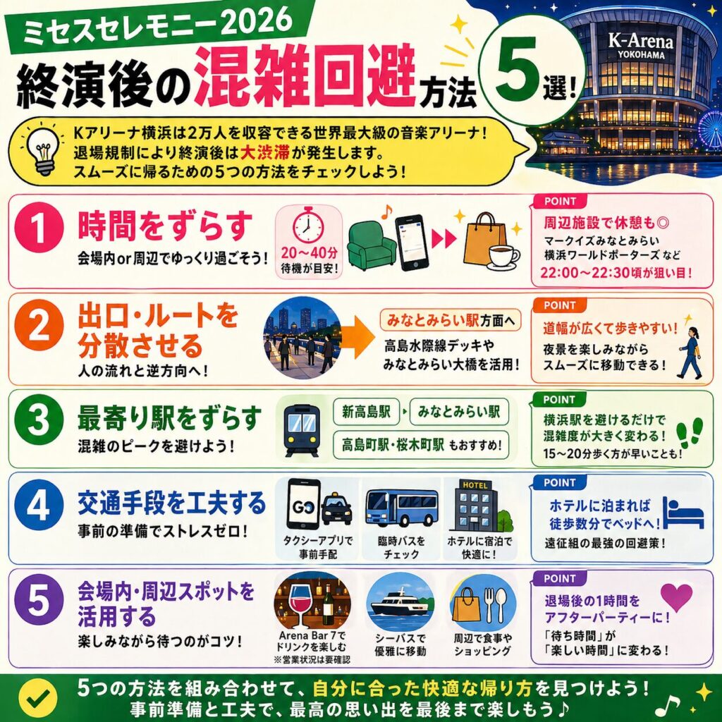 - 終演後の大混雑は、時間差退場、逆走ルート、周辺施設の活用などで賢く回避する。