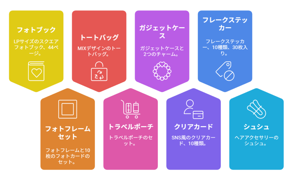 前作のように「フォトフレーム&フォトカードセット」「クリアカード」「フレークステッカー」などのコレクション性の高いアイテムは、ファンにとって嬉しい要素でした。