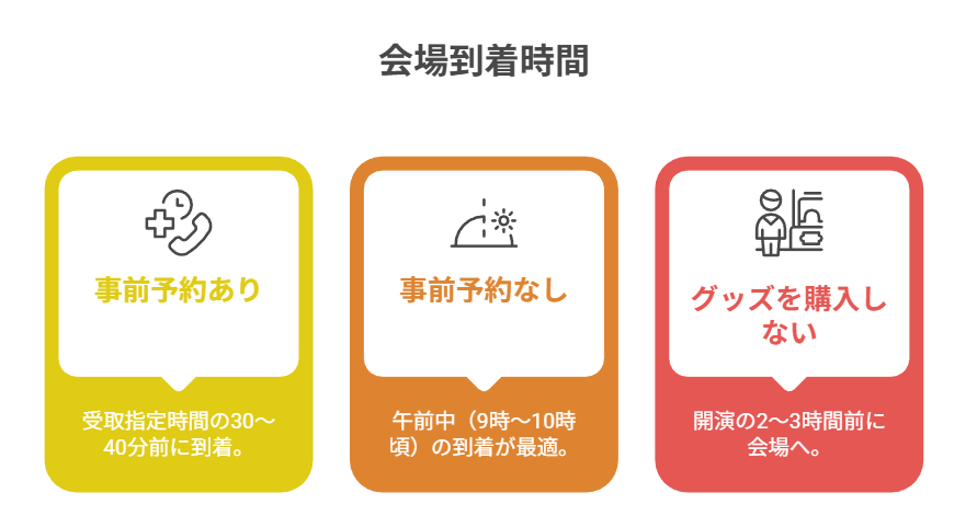 グッズを購入しない場合でも、開演時間の2〜3時間前には会場に到着するのが理想的です。