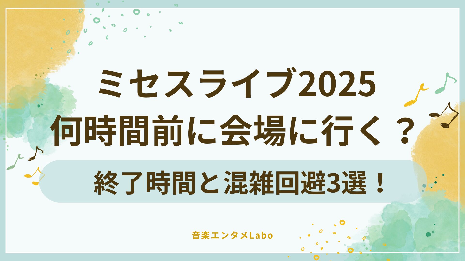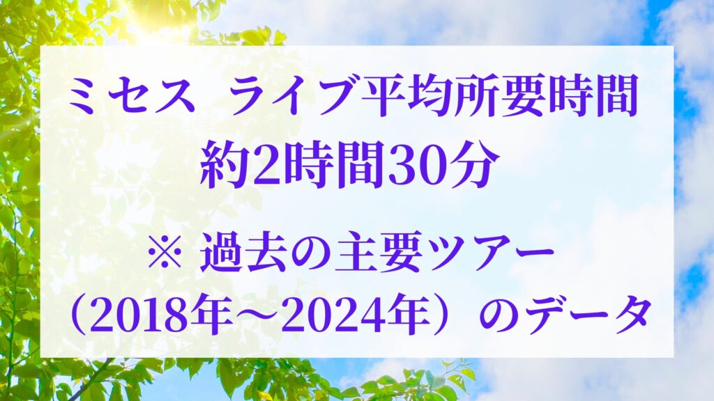 ミセスのライブ終了時間は、過去のライブ実績から約2時間〜2時間30分が目安です。
