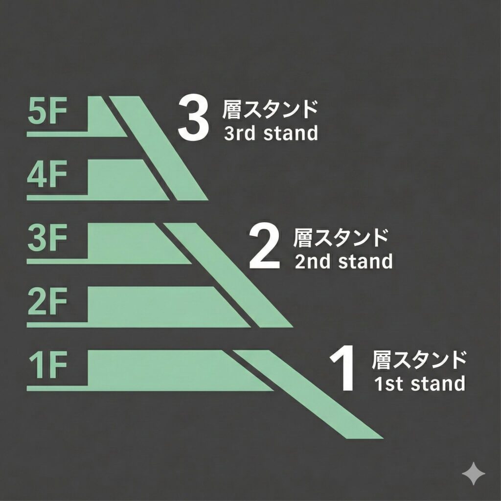 2層・3層スタンド席の特徴は、次の通りです。