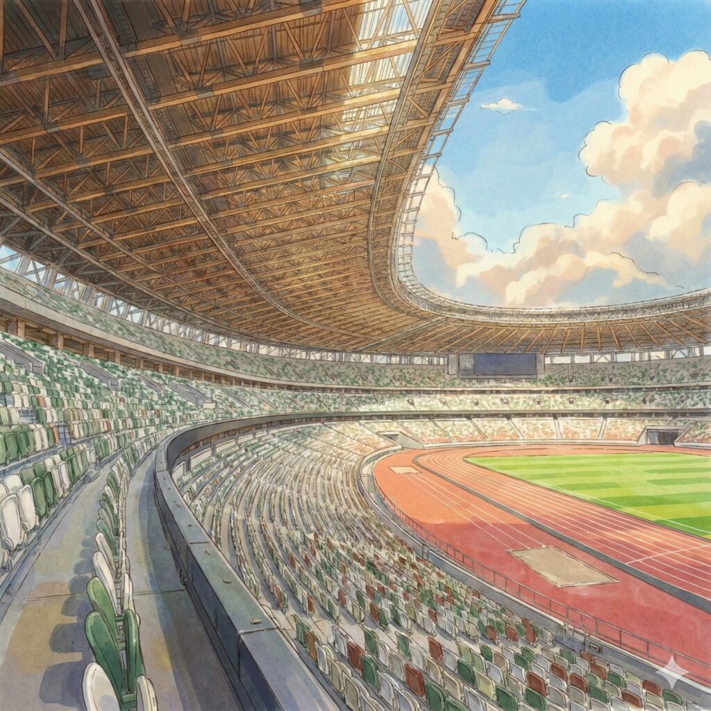 国立競技場は、サッカー・陸上競技を前提に設計された横に広く、縦に積み上がる屋外スタジアムです。
