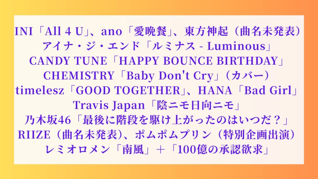 ≪初回2hSP 出演アーティスト≫#INI#アイナジエンド#ano#CANDYTUNE#CHEMISTRY#timelesz#東方神起#TravisJapan#乃木坂46#HANA#RIIZE#レミオロメン