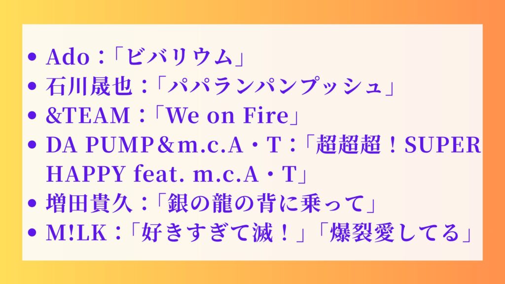 続いては、皆さんが一番気になっている「今日の出演アーティストと歌唱曲」を一覧でご紹介します。