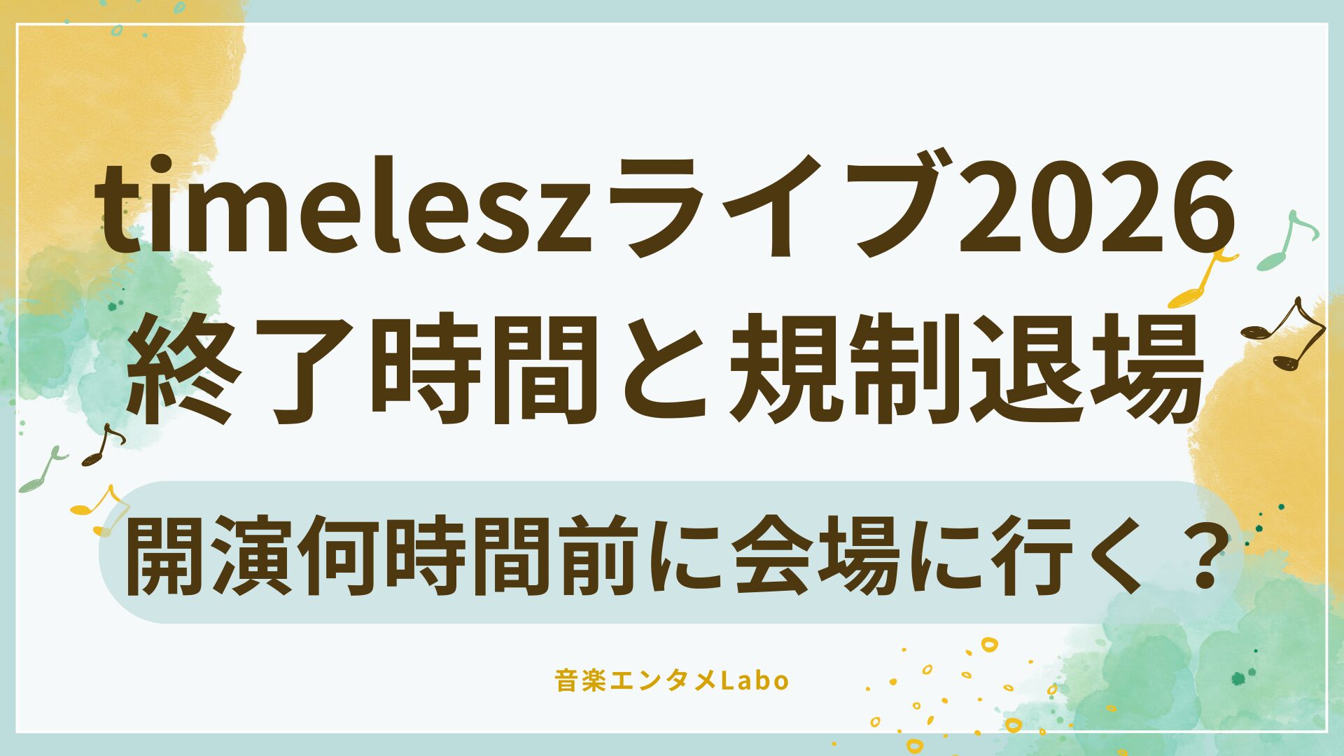 timeleszライブ2026の終演時間は、開演から「約2時間10分〜2時間30分」に、アンコールと規制退場の時間を含めた目安となります。