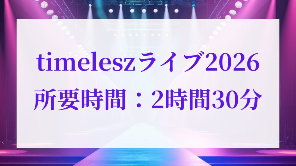 timeleszライブ2026の終演時間は、開演から「約2時間10分〜2時間30分」が目安です。
