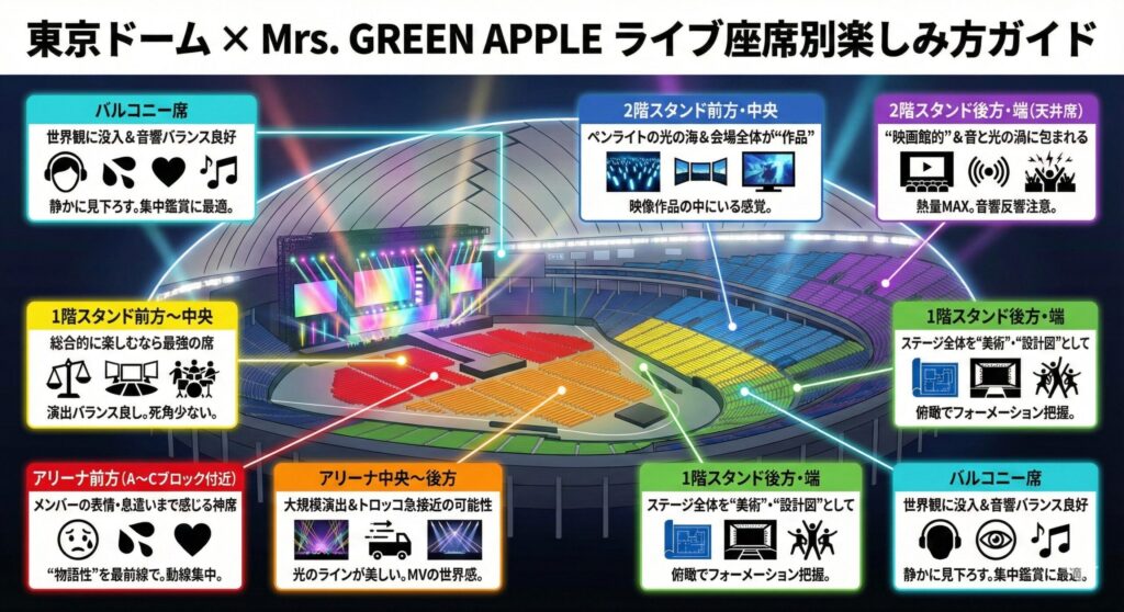 東京ドームで開催されるミセス(Mrs. GREEN APPLE)のライブは、同じ会場でも「どの席になるか」でまったく別の体験になると言われています。