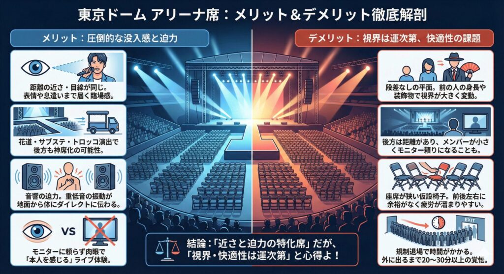 つまり、アリーナ席は“近さと迫力の特化席”であると同時に、“視界・快適性は運次第”という席でもあります。