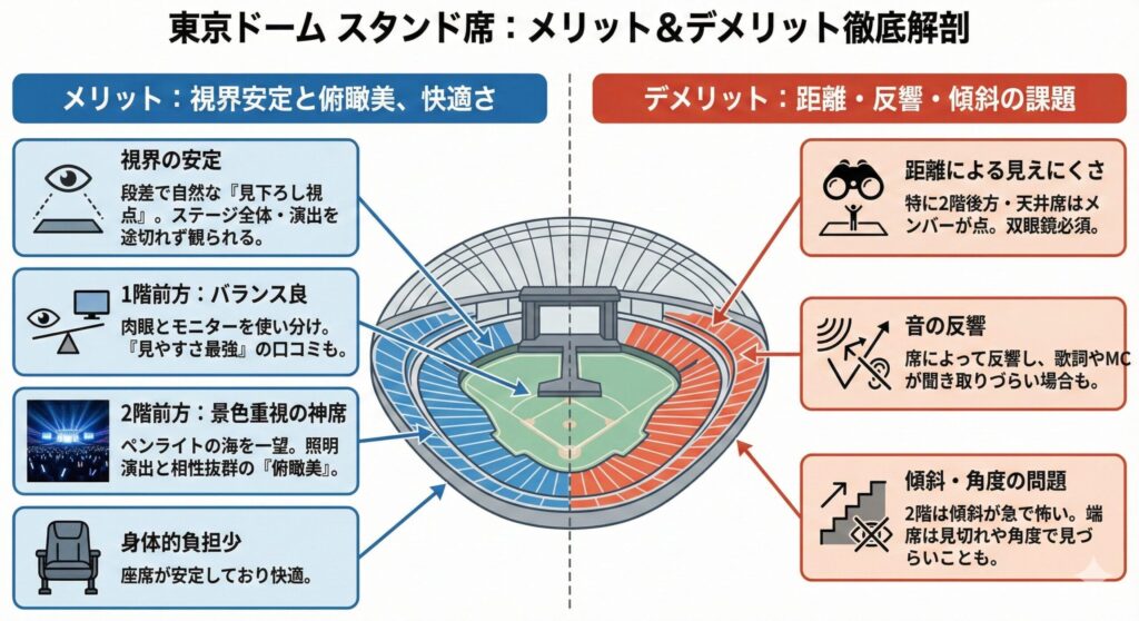 スタンド席は“見やすさの安定感”が魅力ですが、距離・反響・傾斜といったドーム特有の弱点も把握しておくことで、期待値を調整しながらより楽しめる席になります。