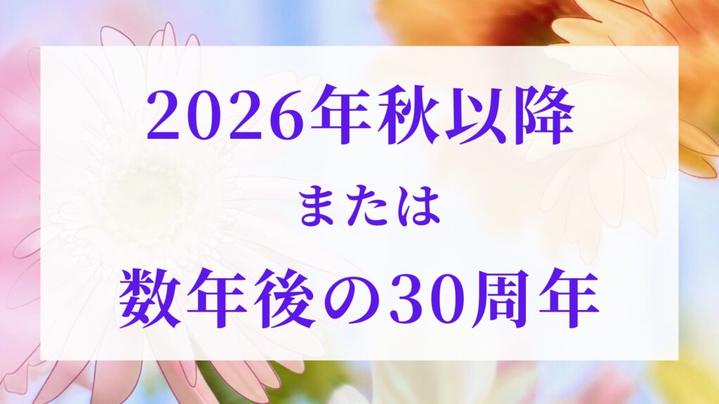 しかし、過去の開催周期や最新のリリース状況から、開催されるとすれば2026年秋以降または数年後のアニバーサリーイヤー(30周年)になる可能性が高いです。