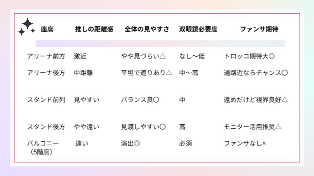 読み終える頃には、自分の席がどこでも不安なくライブを楽しむ準備が整い、当日を前向きな気持ちで迎えられる状態になれます。
